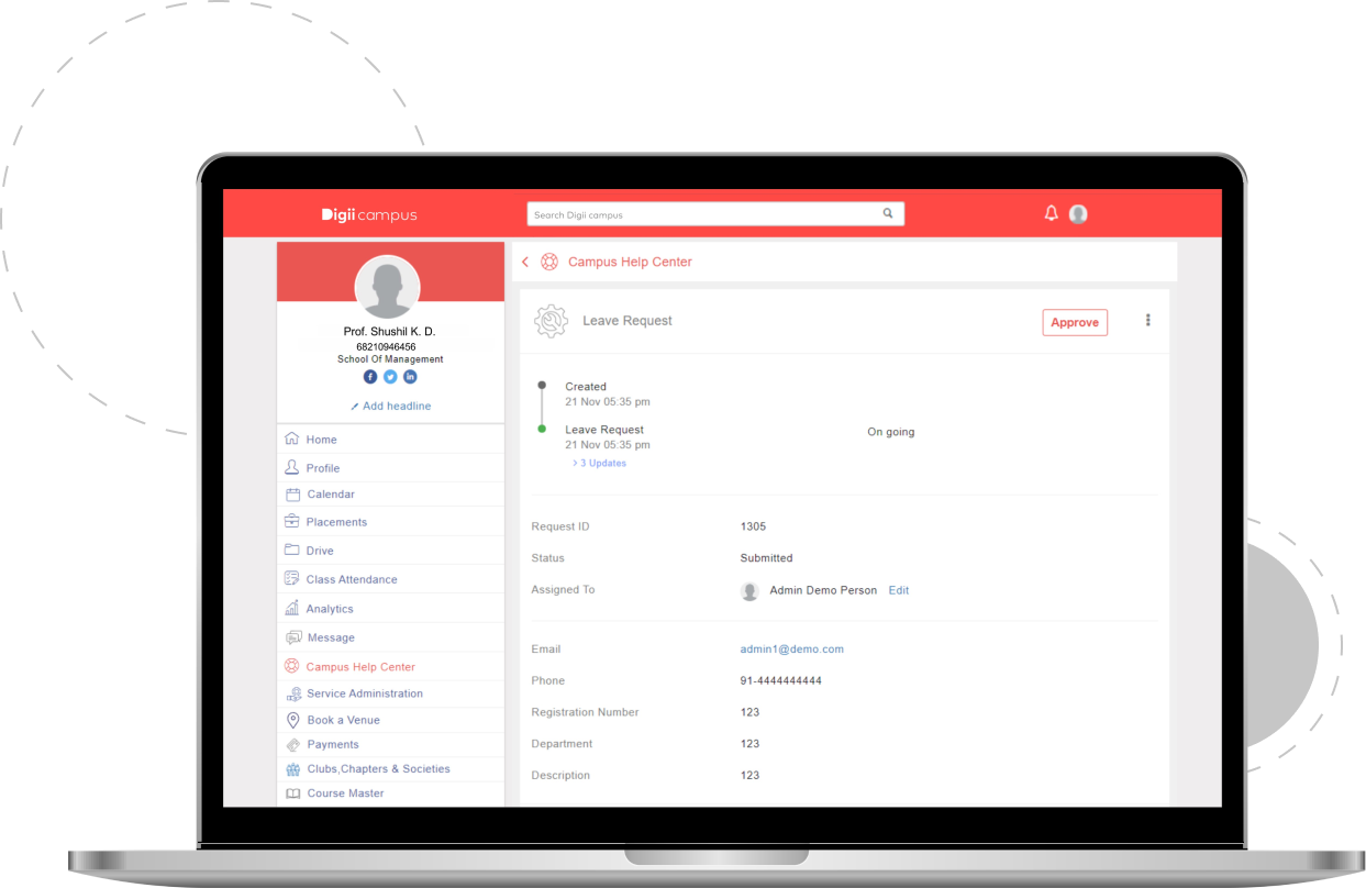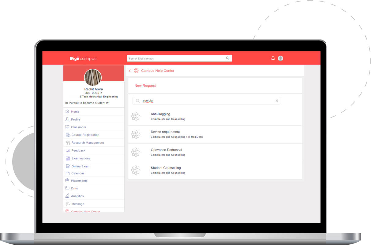 Digiicampus’ Help Center is designed to manage all grievances in compliance with all UGC and AICTE guidelines to automate 1000+ campus workflows, manage and track students’ requests for different services, and much more.